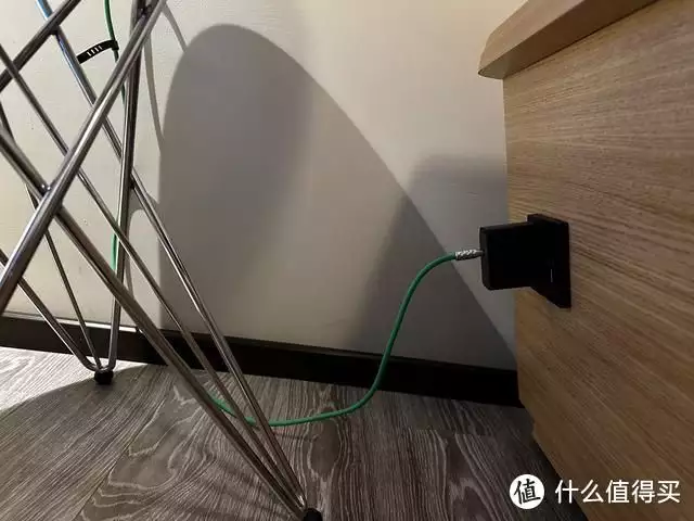 但这个茶水台兼床头柜的设计就很迷,逼得你只能在枕头旁边烧热水。此外,这个位置的插座更让人尴尬,如果想在桌子上用电脑,没根长数据线绝对让人郁闷。