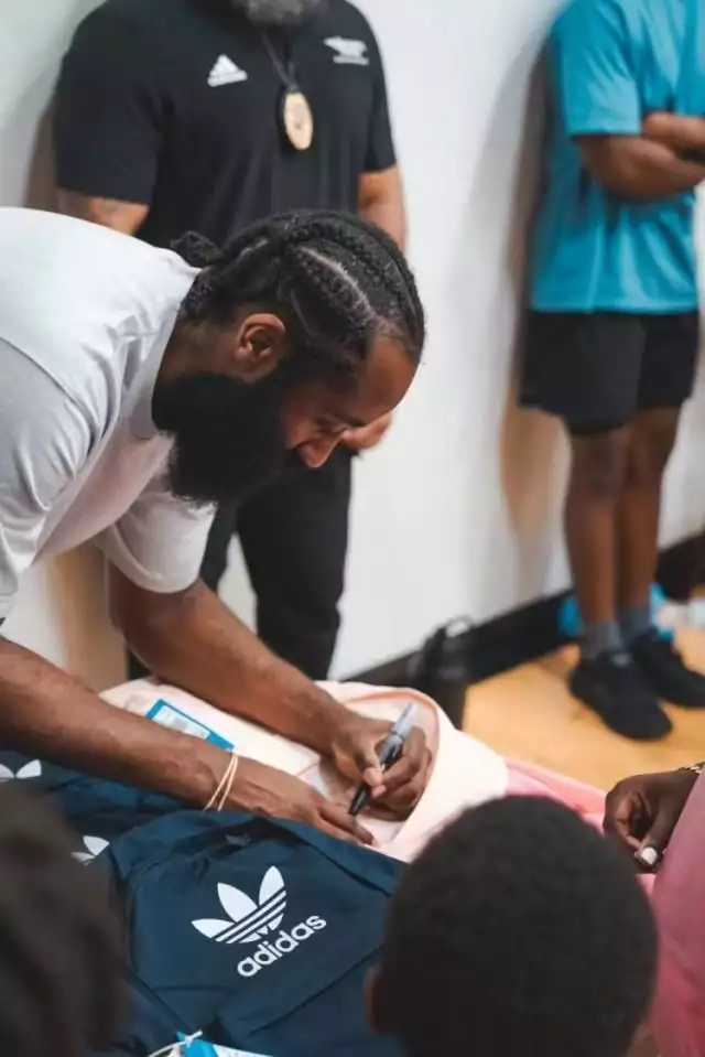 今天,哈登继续他的公益事业,为小球迷发放书包,并签名。
