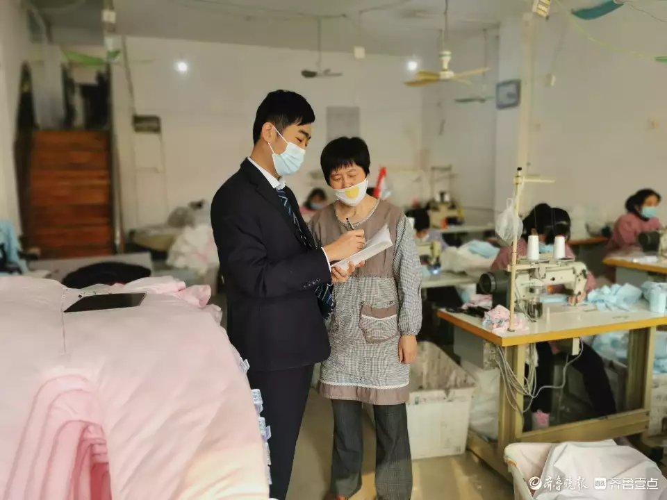 (工作人员到饶桂兰服装加工作坊走访问需)