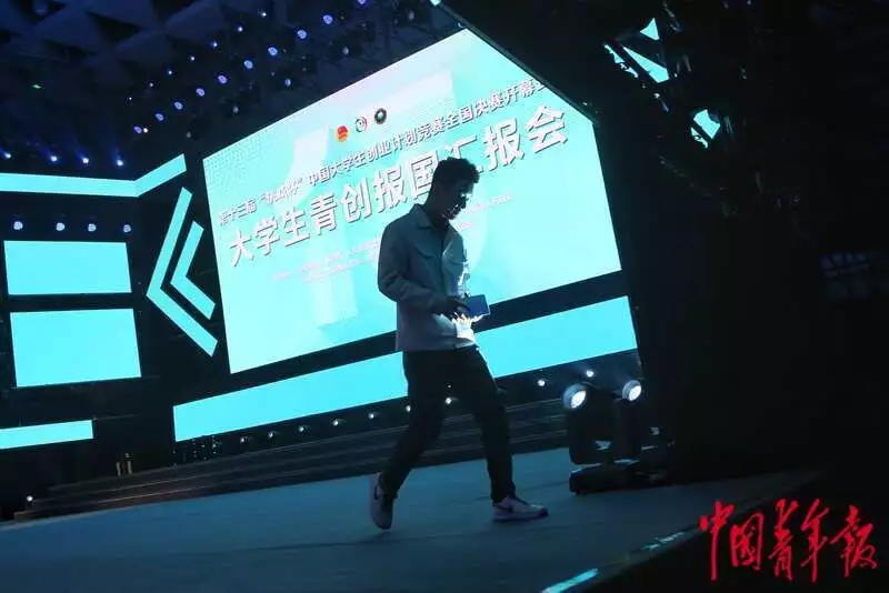 3月17日,北京理工大学良乡校区,第十三届“挑战杯”中国大学生创业计划竞赛全国竞赛开幕式暨大学生青创报国汇报会上,安徽职业技术学院学生李云龙在题为《青春因坚持而绚烂多彩》的演讲后走下舞台。中青报·中青网记者 赵迪/摄
