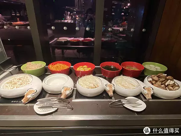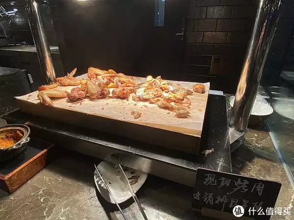 我们先直奔海鲜区,有罗氏虾、青口、海螺、鲍鱼、扇贝、小螃蟹、濑尿虾。刺身区有两种希鲮鱼、吞拿鱼、白色的忘记是什么鱼(油鱼?不会吧)、纯黄色的不知道是什么肉、以及棕色边缘的海参(我也没吃过这样的海参)。我以为没有三文鱼,后来问了路过的服务员,才知道三文鱼是鲜切,需要的时候叫刺身区的服务员切给我。这位服务员的态度十分好,主动问我要不要给我拿,拿多少份。我说要两份,数量大约是六七片吧,感觉不够吃哈哈哈哈。但是真的有点被暖到。