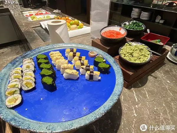 刺身区旁边是寿司区,但是种类乏善可陈。可以理解。不过既然都有刺身了,我还吃这些平价的寿司做啥呢(平时也吃太多了)。调料方面,有红姜,腌制的小黄瓜,芥末,(看起来是磨出来的)山葵,酱油。