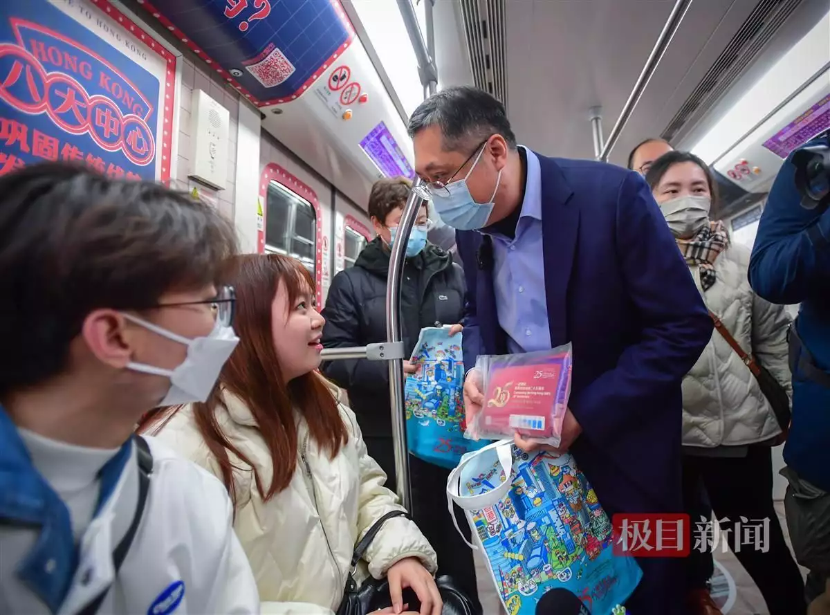 2月10日上午,极目新闻记者跟随香港驻武汉办主任郭伟勋来到地铁车厢内,郭伟勋与乘客交流互动,分享香港的最新发展并派发纪念品,邀请他们一起了解今日的香港。