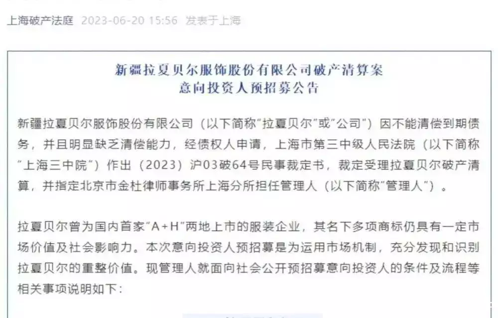 前段时间,“上海破产法庭”公众号发表公告表示,由于新疆拉夏贝尔服饰股份有限公司不能清偿到期债务,已被法院受理公司的破产清算,债权金额高达3.4亿元。
