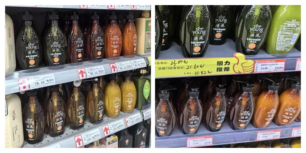 滋源无患子保湿滋养洗头水标价 左图为某超市、右图为乐尔乐上河国际超市 财联社记者摄