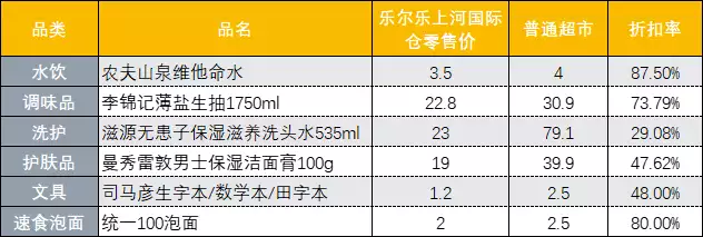 以乐尔乐上河国际超市为例,据招商人士介绍,在这个面积2万多平方的超市内,有接近6万个SKU,涵盖零食水饮、粮油调味、洗护护肤、纸品清洁、儿童玩具、厨房用具等多个品类。财联社记者对比发现,与普通超市、便利店相比,其商品价格便宜了12%以上,个别商品甚至便宜了70%。