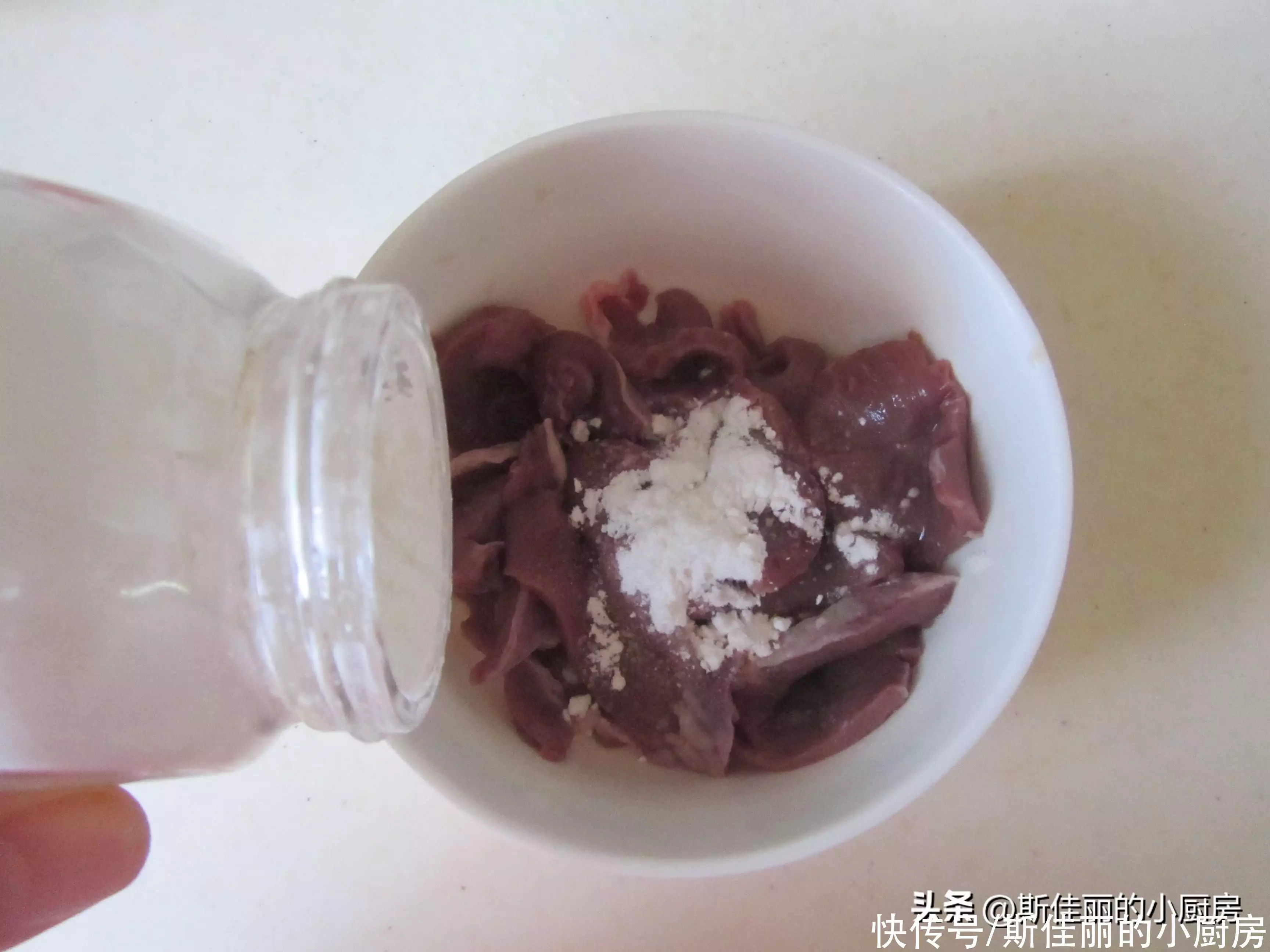 1. 买回来的猪心切片后放入加了白酒的水中浸泡二十分钟后冲洗干净,这样是为了去除猪心的异味; 处理好的猪心加入盐、料酒、生抽和淀粉等调味料拌均匀腌制一下;
