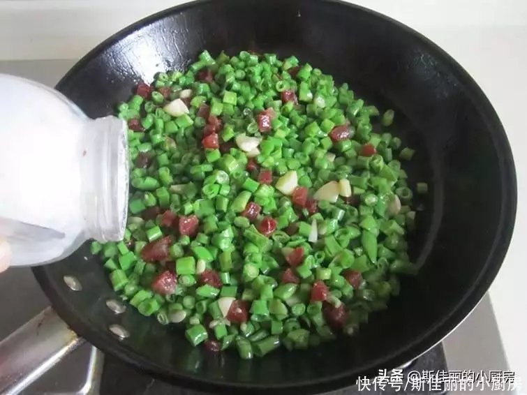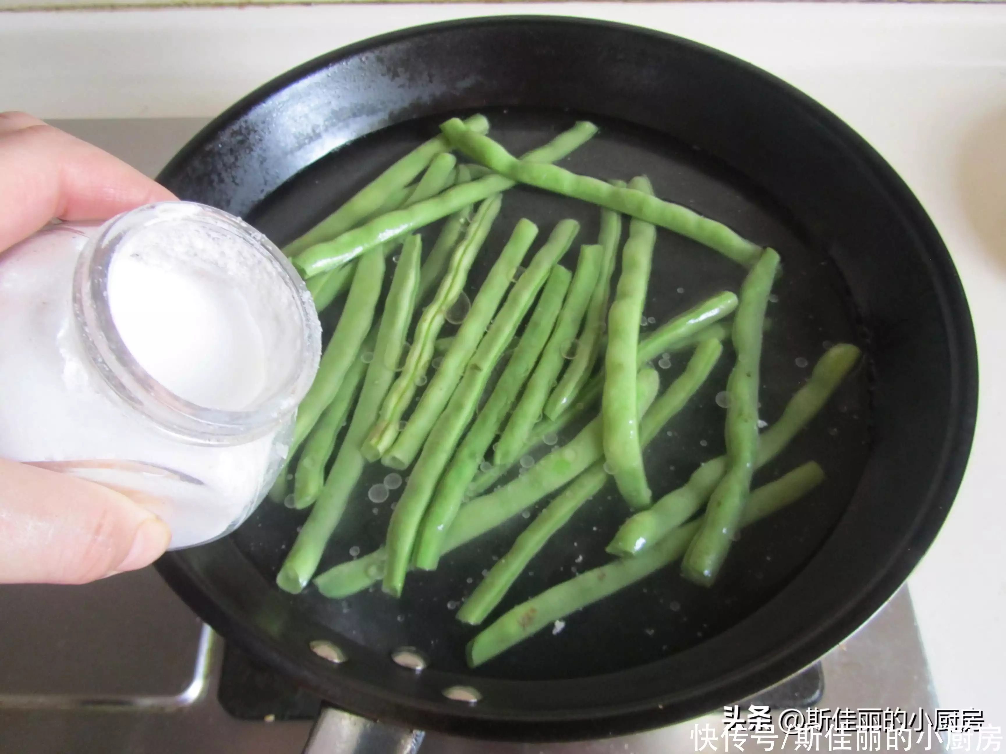 5. 加入准备好的四季豆进锅翻炒几下,注意四季豆一定要炒熟了吃,避免吃不熟的四季豆中毒;