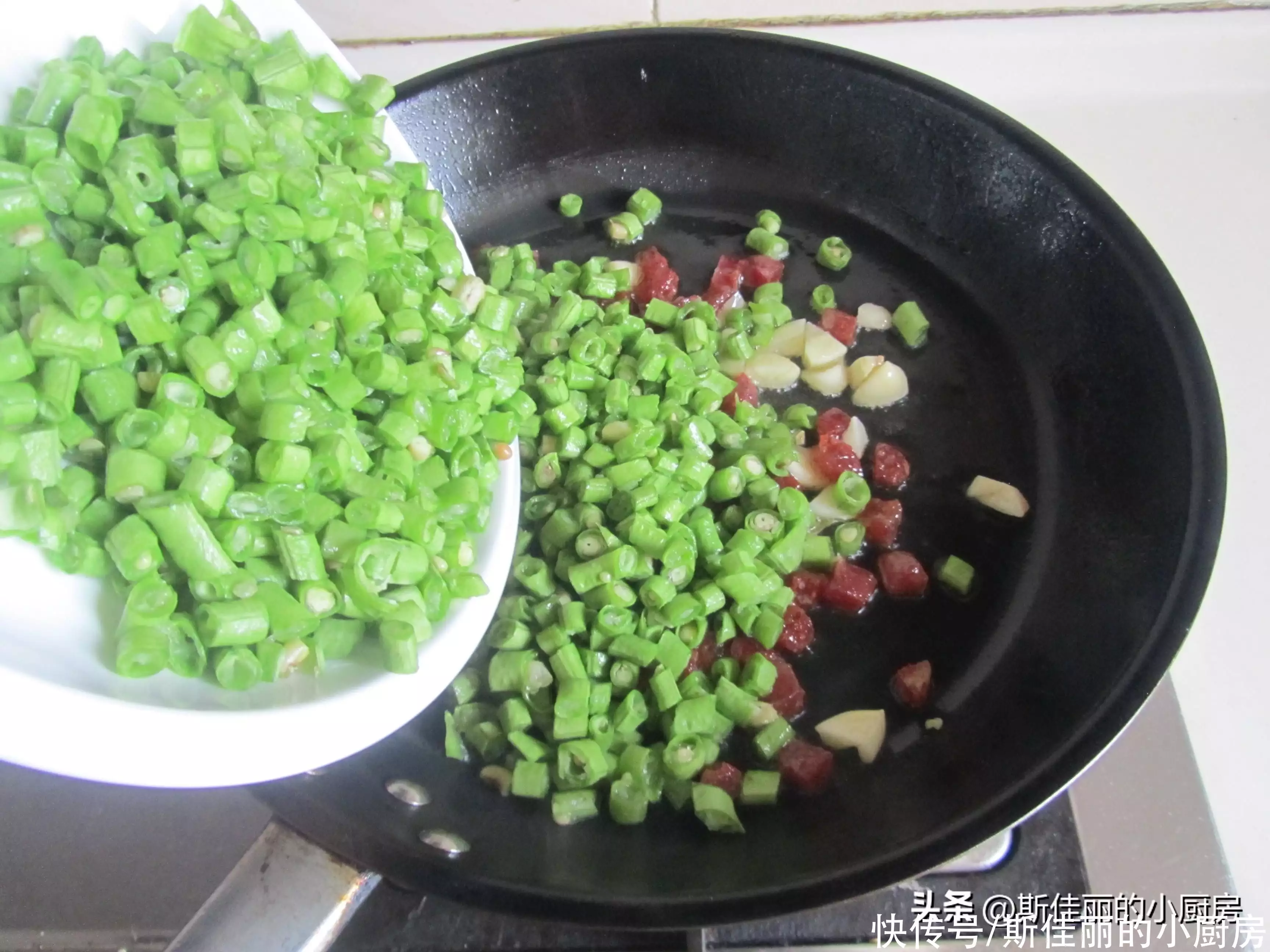 3. 加入准备好的豆角丁进锅翻炒,这样炒豆角丁比较容易熟得快;