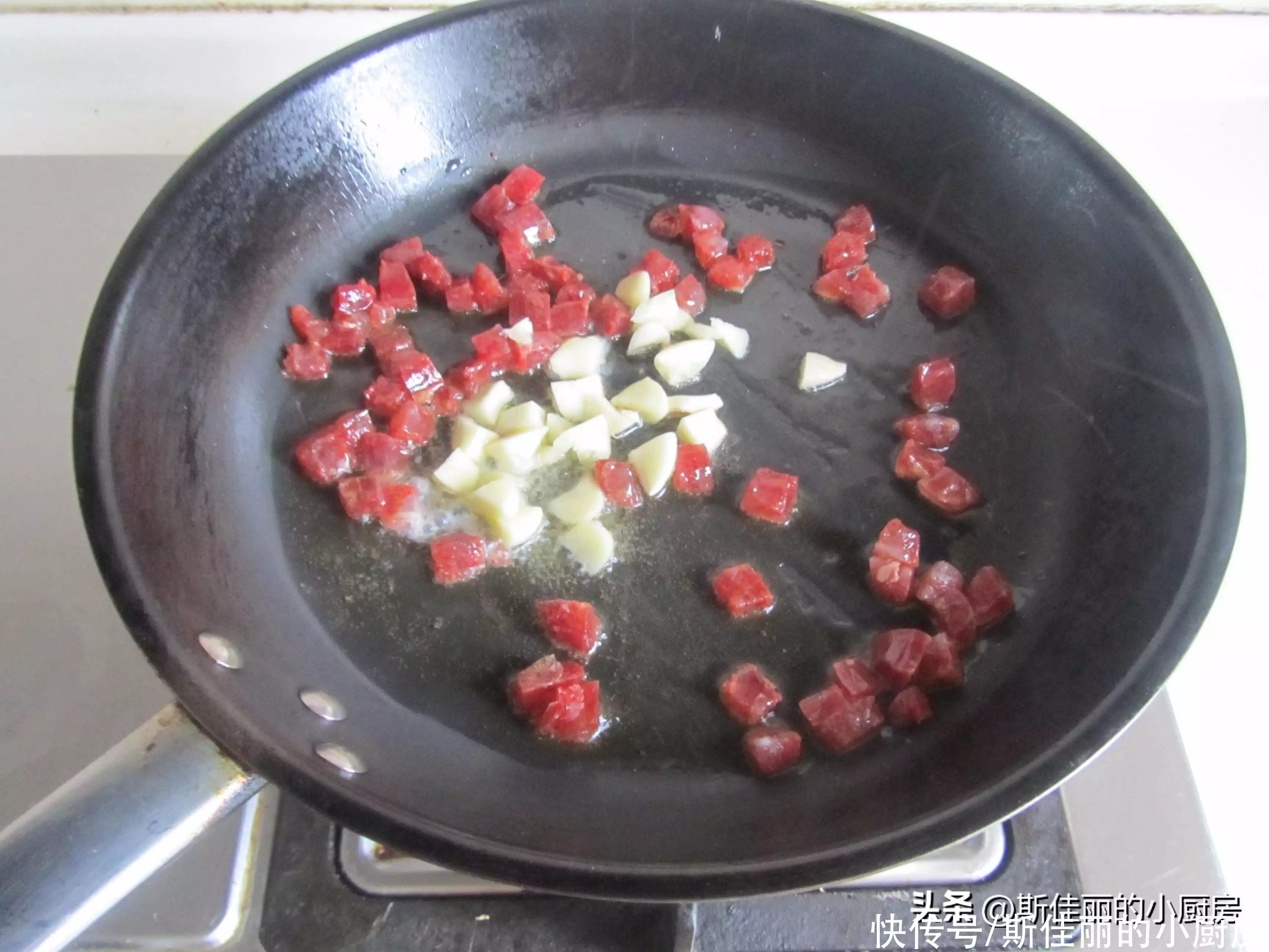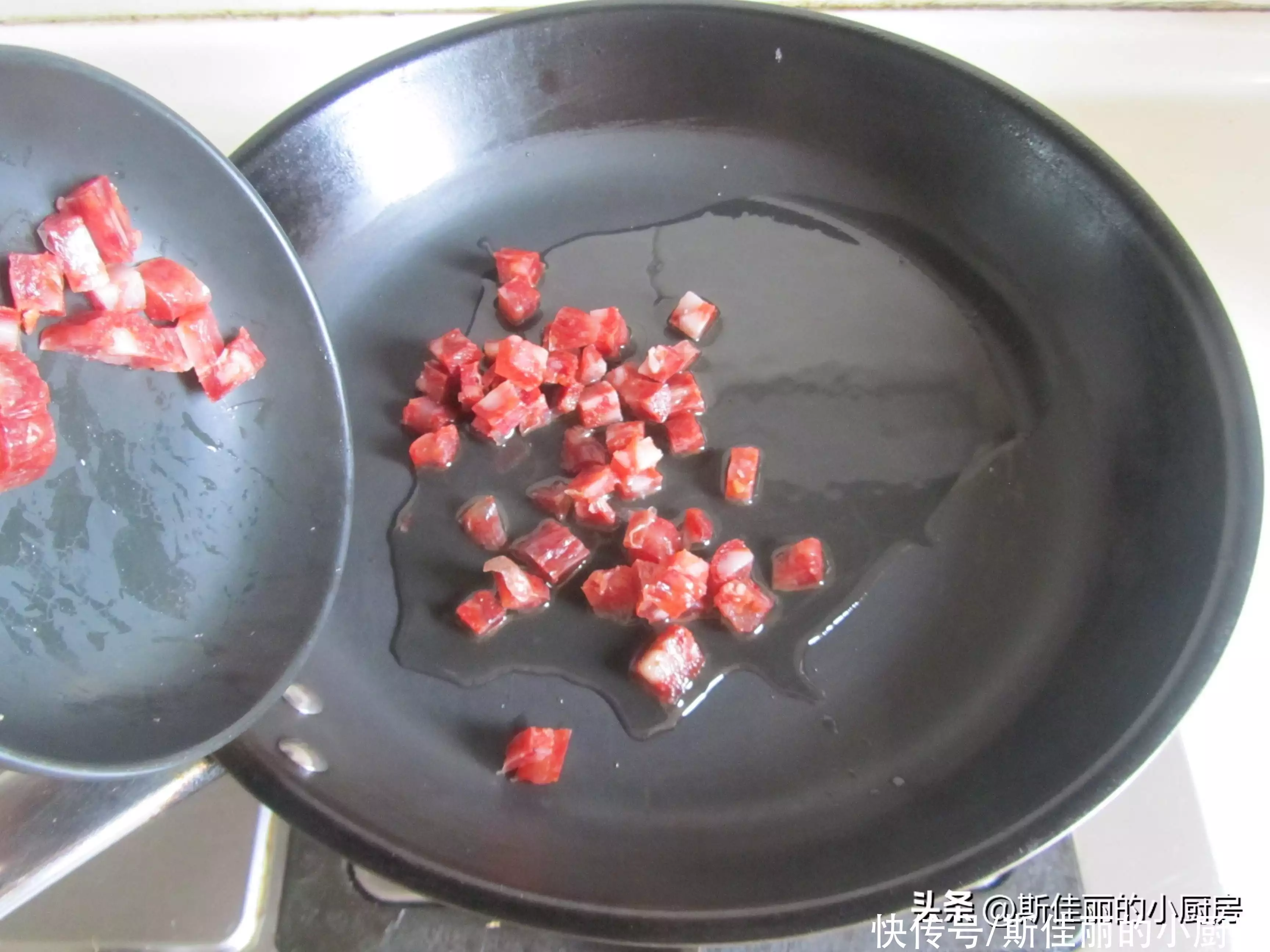 制作:1. 热锅凉油, 将腊肠丁放入锅翻炒,炒至微微出油; 我的腊肠是提前蒸过的, 是熟的,如果没有蒸制, 先加入少许水焖煮一下,再煎出油脂来;