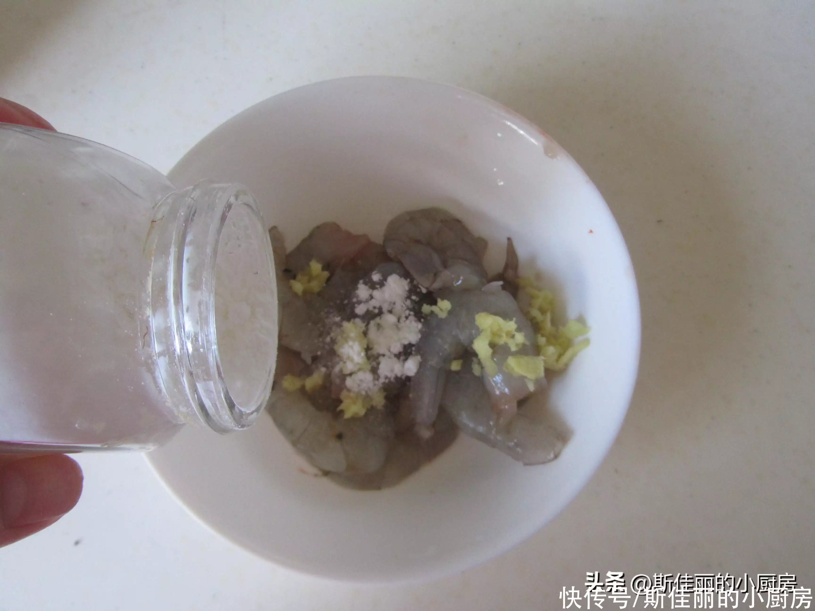 2. 处理好的虾仁加入少许盐、淀粉、料酒和姜末等调味料拌均匀腌制一下;