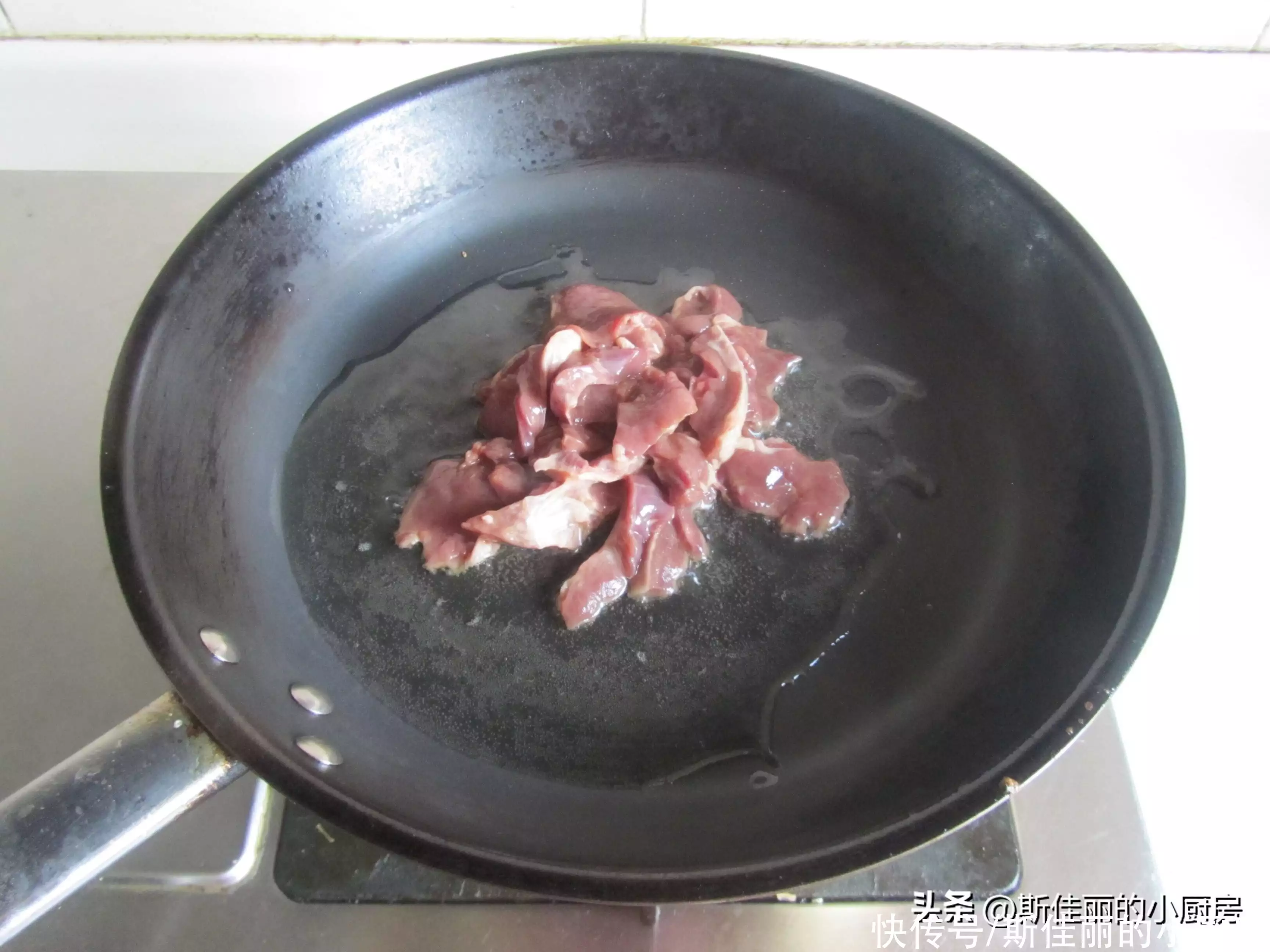 2. 烧热锅放入少许油, 加入腌制好的猪心片进锅翻炒至变色;