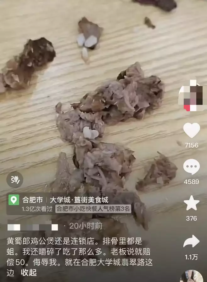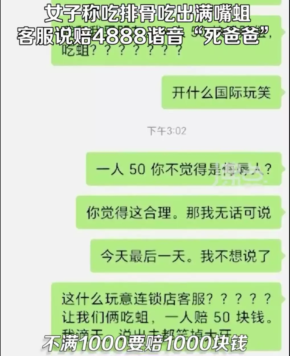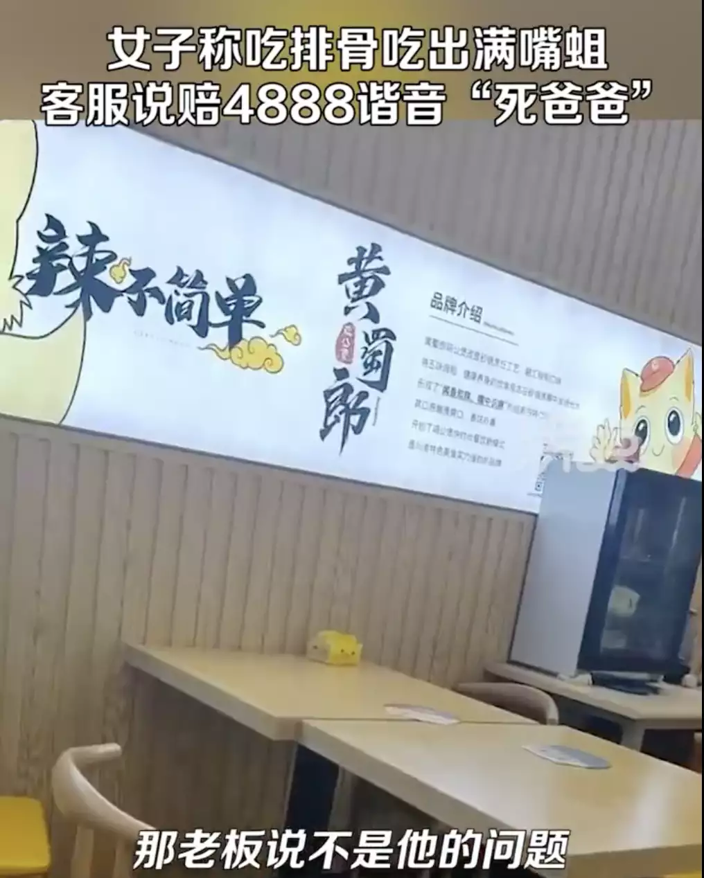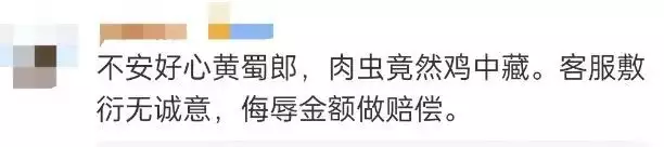 对此网友评论:“不安好心黄蜀郎,肉虫竟然鸡中藏。客服敷衍无诚意,侮辱金额做赔偿。”