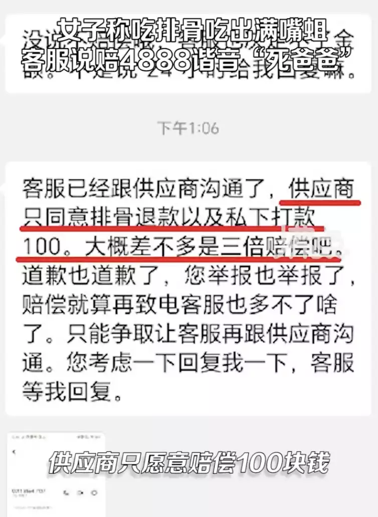 在与老板理论后,老板称排骨有蛆不是自己的问题,自己是连锁店,所以是供应商的问题,并表示供应商已经同意退款,并赔偿三倍餐款100元左右。