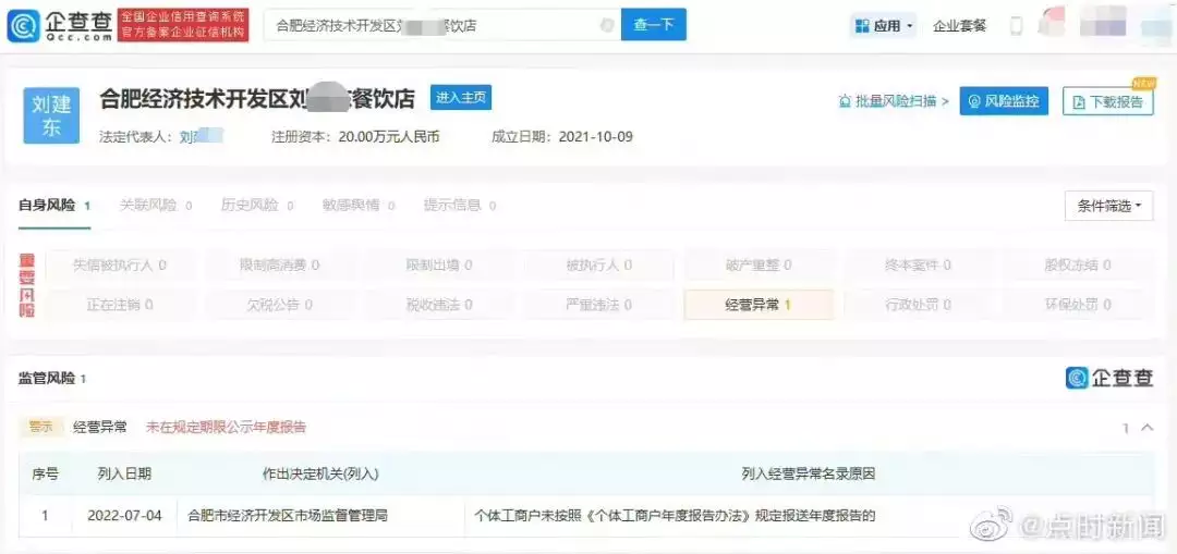 据点时新闻报道,涉事门店为合肥经济技术开发区刘某餐饮店,而根据企查查显示,该门店曾未在规定期限公示年度报告而被列入经营异常名单。