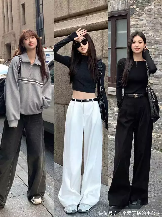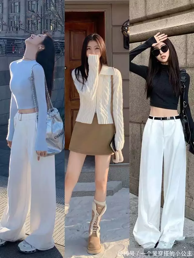 像这种经典的高腰阔腿裤,在韩系穿搭中黑色或者白色都是耐穿的。如果要清爽醒目的美,就搭配白色阔腿裤。如果要沉稳高级的美,就可以搭配黑色阔腿裤。