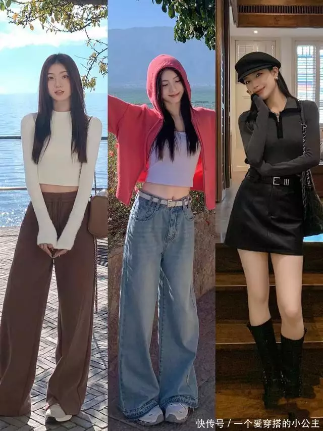 像这种露脐的针织衫,或者紧身的针织衫,搭配羊绒的面料亲肤又保暖。我们配高腰阔腿裤的时候,也可以选择加绒加厚的高腰阔腿裤,抬高腰线又显得双腿修长。