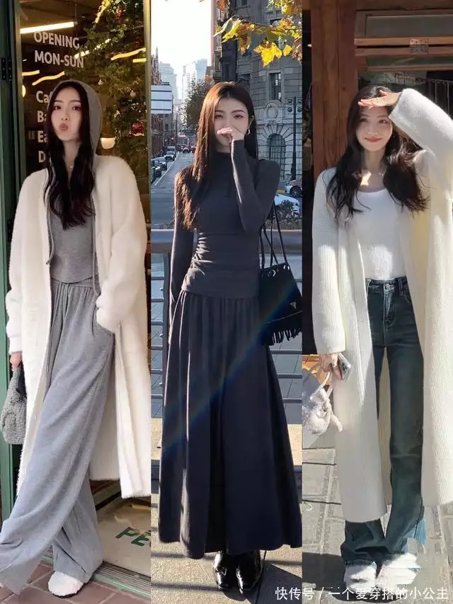 比如燕麦色的毛呢大衣,搭配了黑色的连衣裙,温柔又有力量。像这种黑色连衣裙的搭配,配上纤细的腰带、皮带装饰,塑造出高挑的腰线,纤细腰身更加迷人。