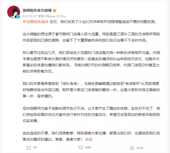 2月9日,茶颜悦色官方微博发文致歉称,春节过后,尝试在小范围的门店内测一种新的点单取杯方案,目前,为期3天的内测期已结束,内测门店现已恢复至之前的点单取餐方式。