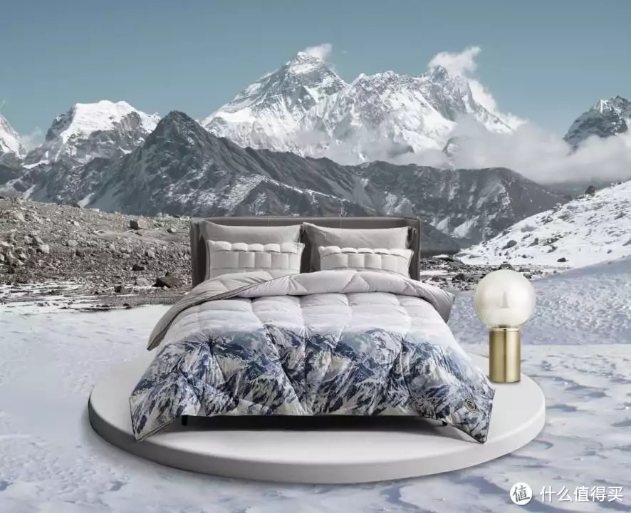 以水星家纺旗下高端品牌水星STARZ HOME推出的“极·御顶凌峰3D经纬立体空间大朵白鹅绒被”为例,该产品选用享誉全球的东北白鹅绒来填充,其绒朵大且饱满,蓬松度高,手感超好,御寒性更强;面料则采用舒适全棉,亲肤度高;设计上通过不同的雪山形态来展示独特的自然美,同时搭配反光英文烫印“幸运总是不期而遇”给消费者带来祝福,希望其在攀登命运这座高峰时伴有幸运色彩。另外值得一提的是,在工艺上,其采用了3D经纬人体工学立体绗缝,E区绗缝外围为锁温区可阻挡冷空气的进入压边保暖不跑绒,整体绗缝既贴合人体睡眠行为轨迹又可加倍蓄热锁温,也再一次验证了水星家纺的科技感与品质感。