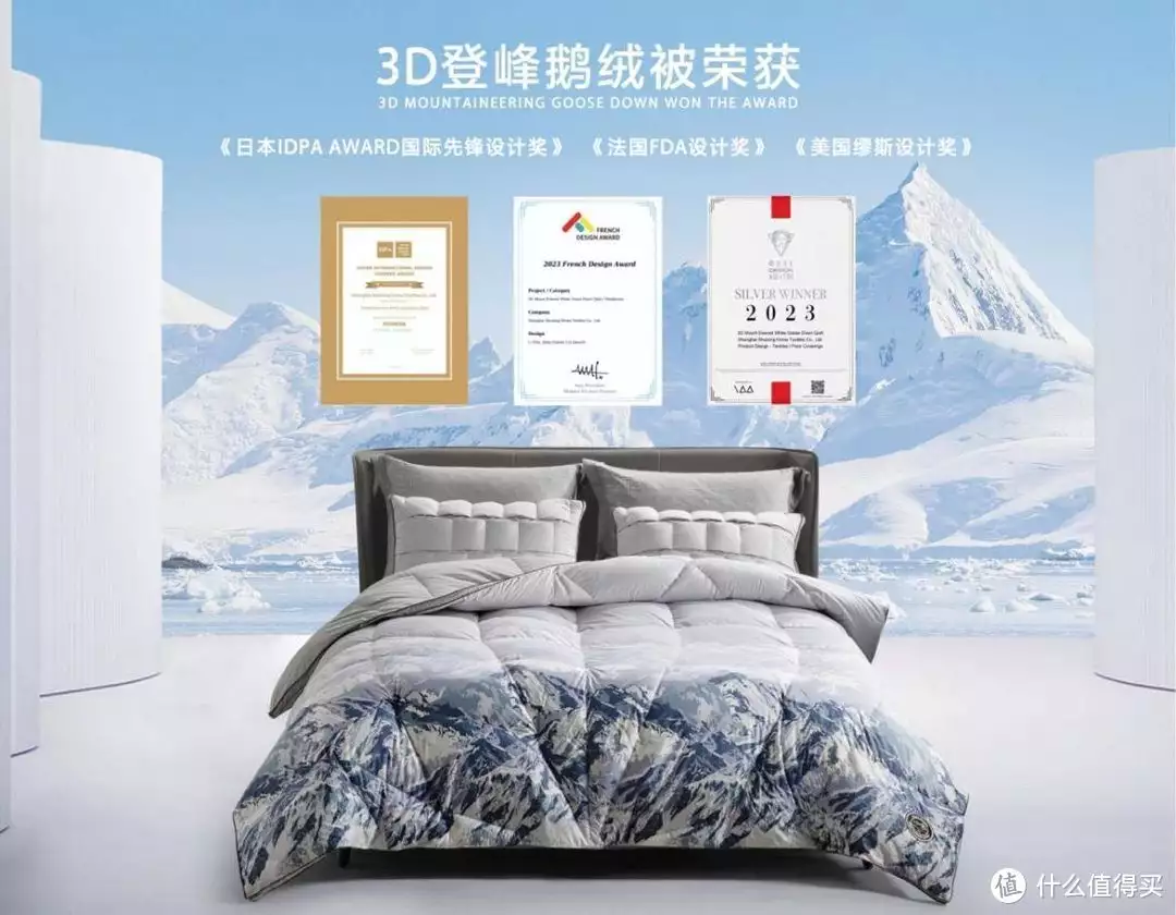 以“3D经纬登峰白鹅绒被”来说,这是水星家纺旗下高端品牌“水星STARZ HOME”设计师团队的作品,被子的外观设计灵感来源于雪原冰川,设计师通过分析不同雪山的自然形态,结合富有节奏感的规律复现模式,去展现雪山自然形态,整体呈现出高端大气,与众不同的美感,同时,产品还使用3D经纬人体工学蓄热分区保暖工艺,帮助消费者更好地调节体温,使得被芯的不同位置都能有舒适的保暖度和排湿透气性,从而真正提高睡眠质量,整体营造出更加舒适的睡眠氛围。