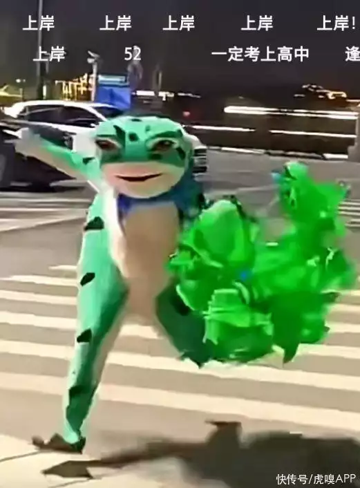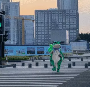 有人在夜晚的街头,拍下过一只带着气球狂奔过马路的青蛙玩偶。