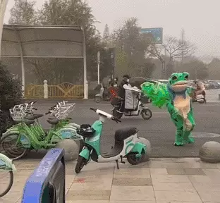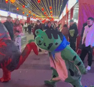 他们带上自己的霸王龙伙伴,在街头表演新式舞龙,为舞狮团队送去一点小小的震撼。