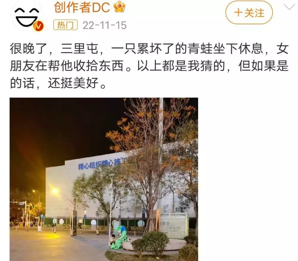 青蛙大军可以出现在潮人密集程度百分百的三里屯,夜里十点等到人潮散去,再在街边卸去伪装,准备乘晚班地铁回去。