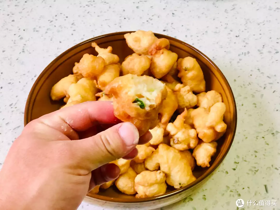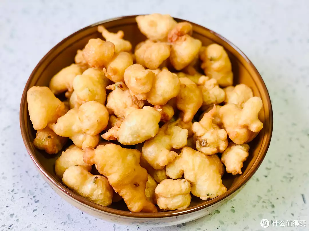 锅中加入适量的菜籽油,油温五成热的时候,用勺子把面糊挖起来,依次下入到锅中,小小的面糊瞬间就会膨胀的特别大,全程保持中火,油温高了容易炸糊,低了炸出来的发硬不好吃。