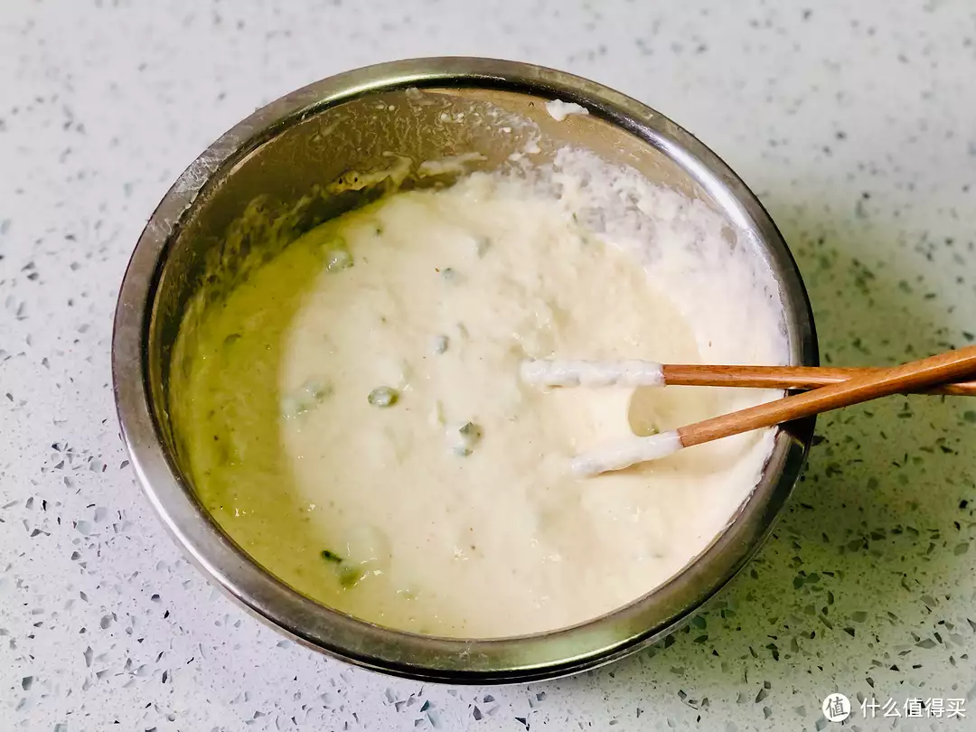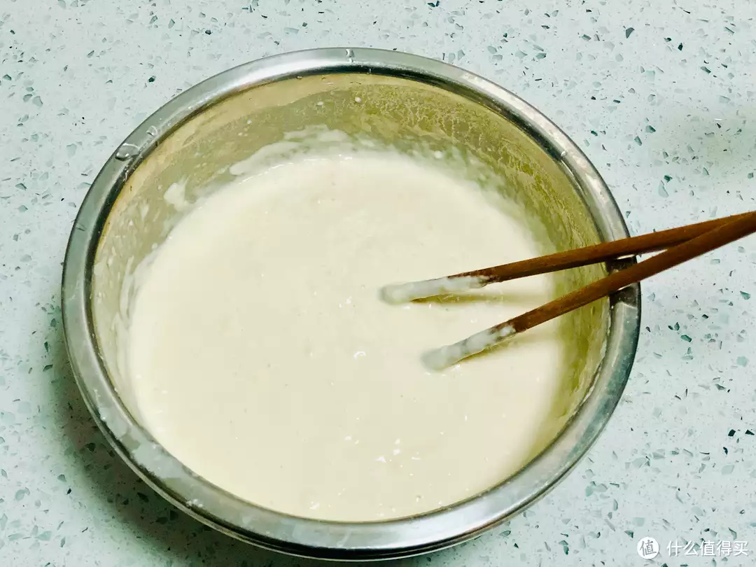 早起的时候,面糊就发酵的差不多了,用筷子挑起来,可以看到面糊里边有浓密的小气泡,这就说明面糊已经发酵到位了。接下来往面糊里边加入少许的葱花、小茴香、食盐,然后搅拌排气备用。
