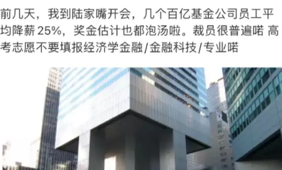 社交平台上早有信息称,某中小公募基金已经开始裁员,“上午谈话,下午走人”,还有财经博主爆料,“前几日,我到陆家嘴开会,几个百亿基金公司员工平均降薪25%。奖金也泡汤了,裁员很普遍,高考志愿不要填经济学金融、金融科技等专业。”