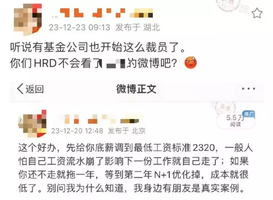 另一位财经博主表示,“先把底薪调到最低工资标准2320,一般人怕自己工资流水崩了影响下一份工作自己就走了;如果不走再拖一年,等到第二年N+1优化掉,成本降低了。”并指出,目前已有基金公司按照此方式裁员了。