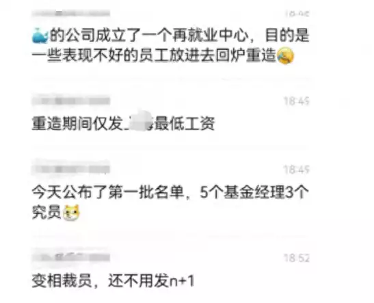 近日,有网传消息称,“公募基金行业出清开始了,某基金公司变相裁员。”当中的聊天记录显示,该基金公司成立了一个再就业中心,目的是让一些表现不好的员工放回去回炉重造,重造期间仅发最低工资,目前已公布第一批名单,5个基金经理与3个研究员,直指该行为是变相裁员,更不用赔偿“n+1”,随后还点名了兴银基金。