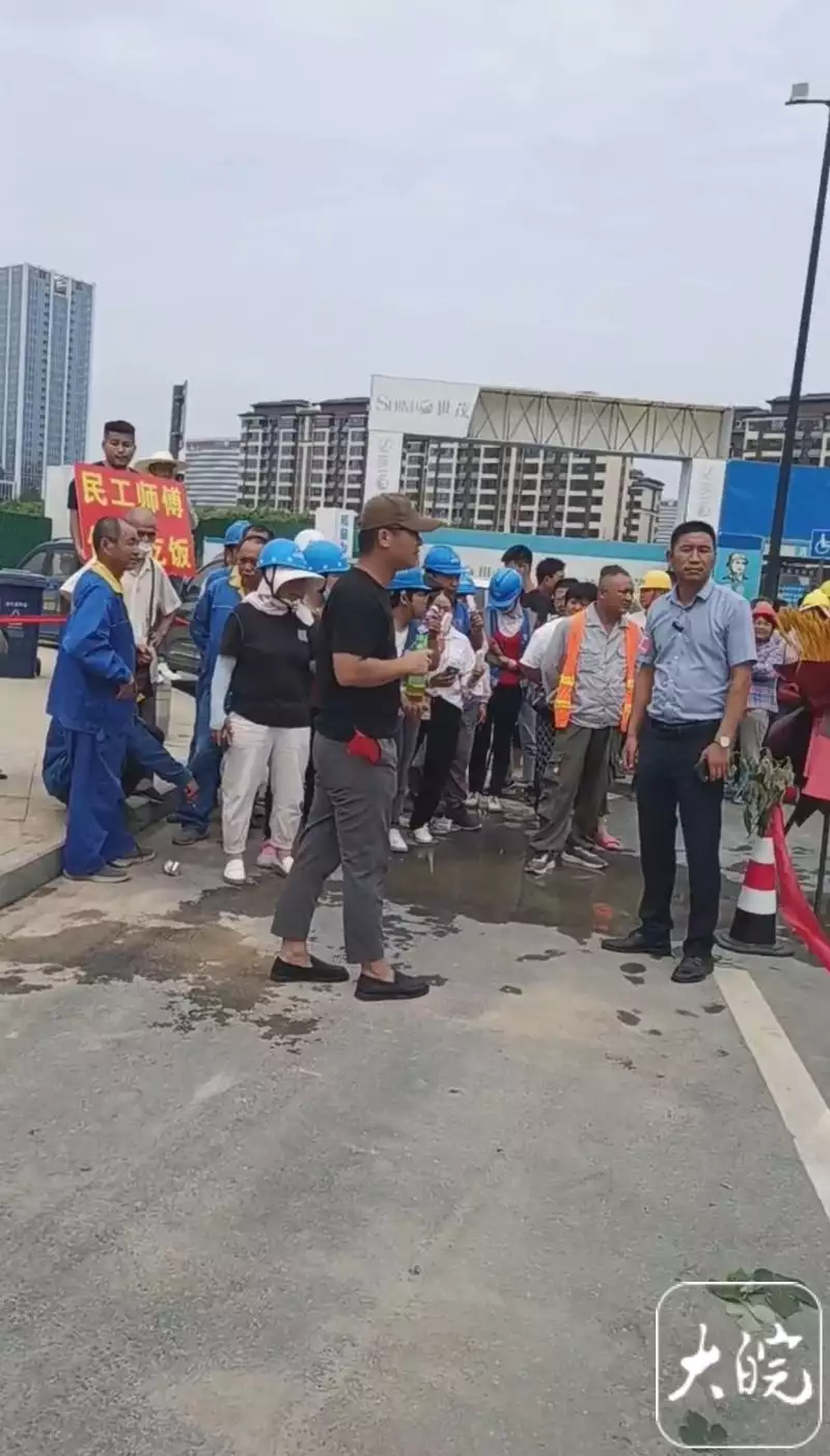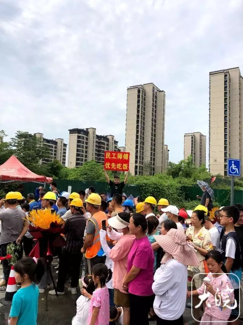 现场志愿者举着“民工师傅 优先吃饭”的提示牌