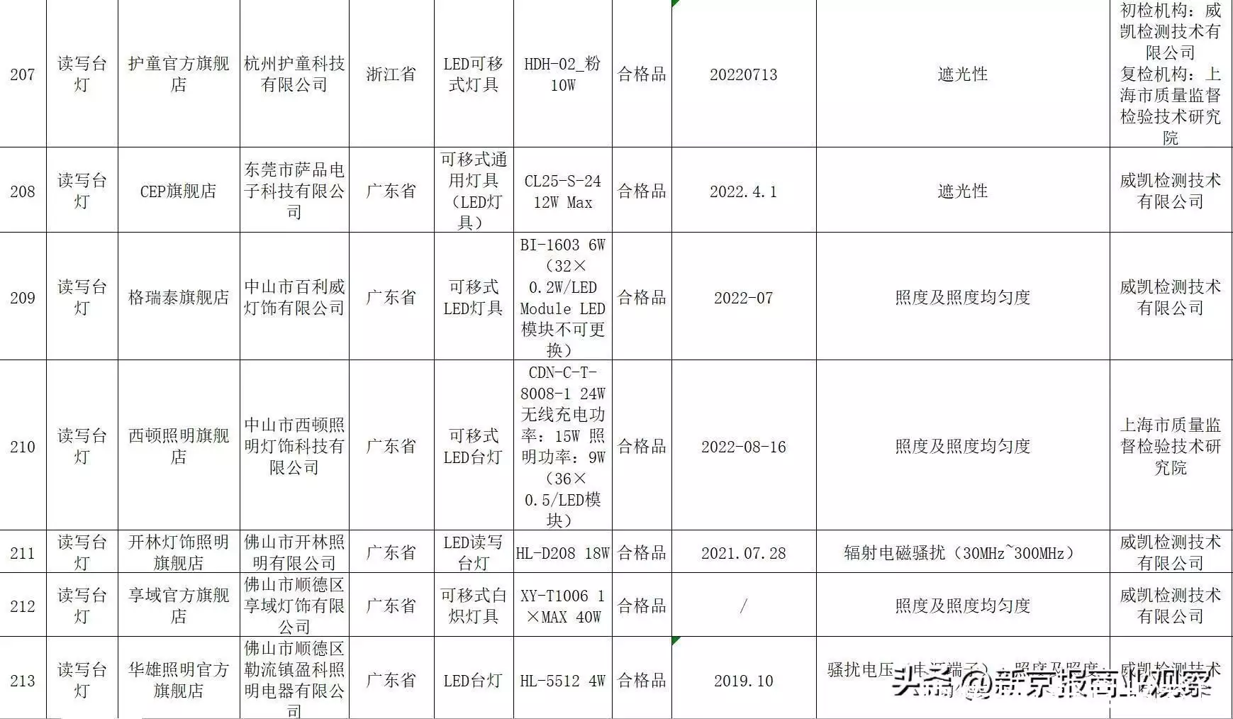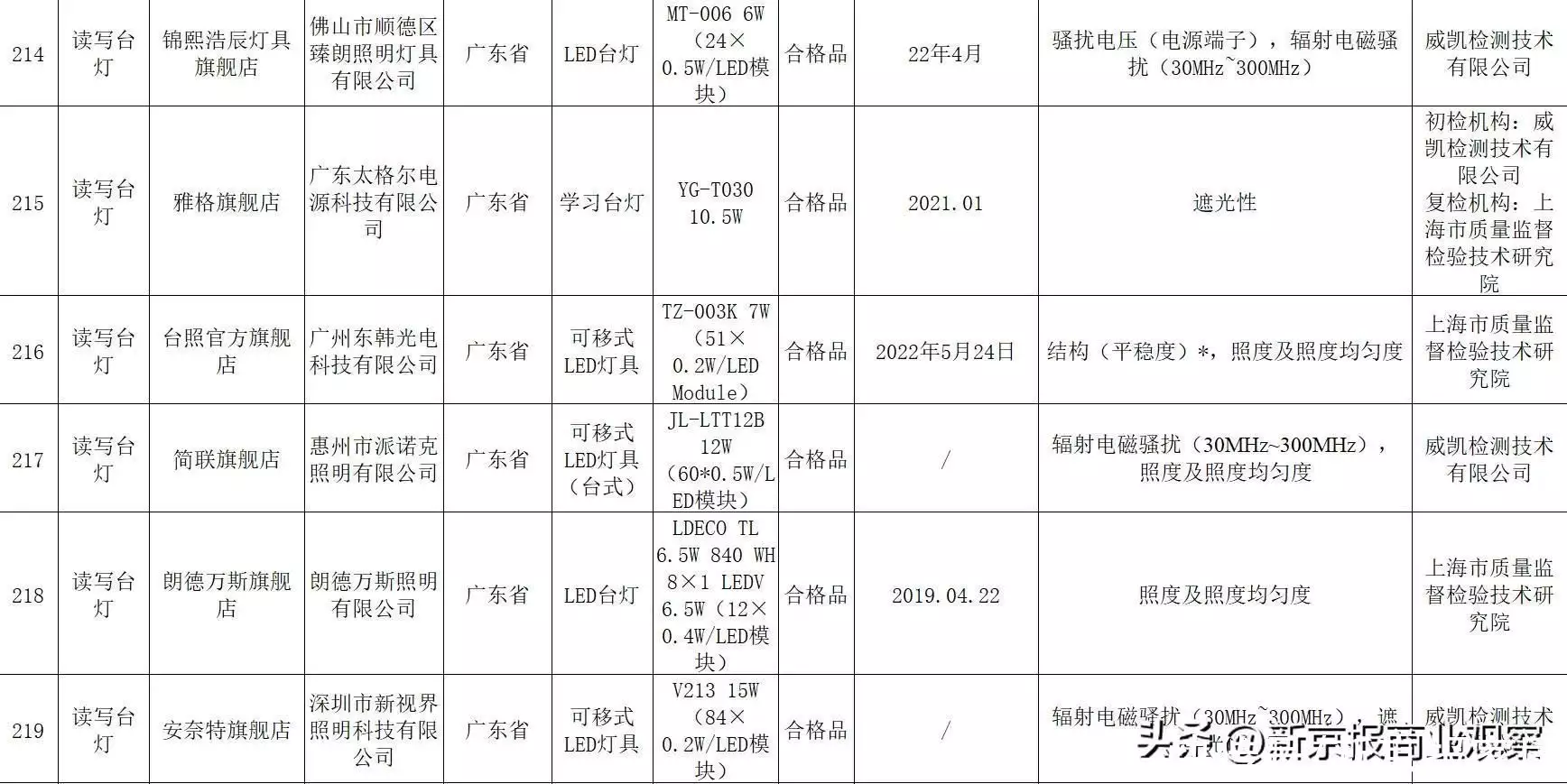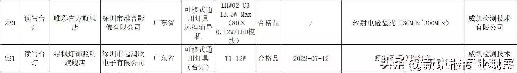 不合格名单显示,标称宜家(中国)投资有限公司生产的读写台灯(规格型号B1701 Krux Max3.4W;生产日期/批号2228),因遮光性,照度及照度均匀度不合格;标称广东太格尔电源科技有限公司生产的学习台灯(规格型号YG-T030 10.5W;生产日期/批号2021.01),因遮光性不合格,且复检仍不合格;标称深圳市新视界照明科技有限公司生产的可移式LED灯具(规格型号V213 15W,84×0.2W/LED模块),因辐射电磁骚扰(30MHz~300MHz),遮光性不合格;标称江苏锦熙照明有限公司生产的LED台灯(规格型号HMB-5003 5W),因耐热、耐火和耐起痕*,显色指数(Ra、R9),照度及照度均匀度不合格;标称广州东韩光电科技有限公司生产的可移式LED灯具(规格型号TZ-003K 7W,51×0.2W/LED Module,生产日期/批号2022年5月24日),因结构(平稳度),照度及照度均匀度不合格。