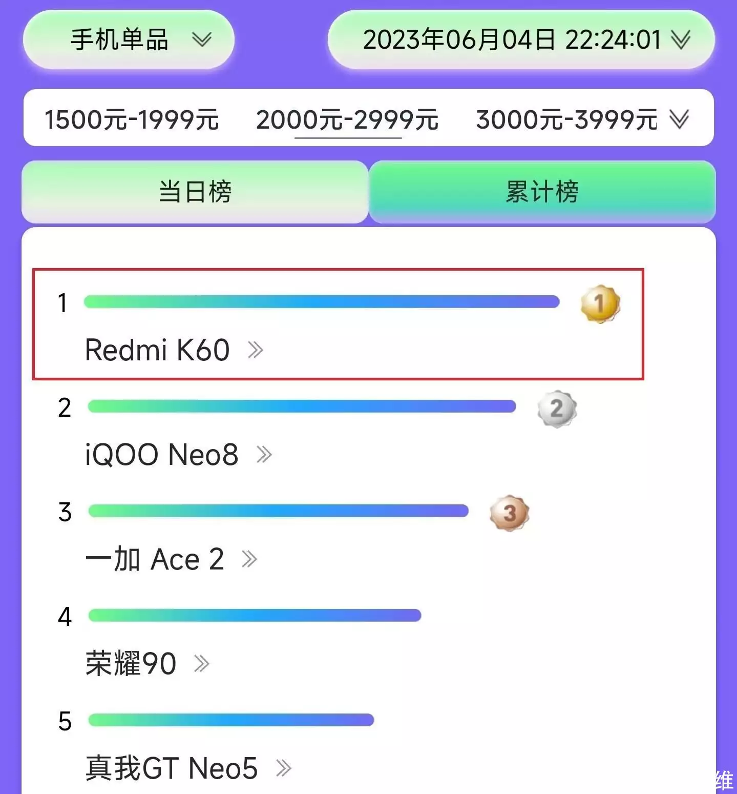 其中OPPO旗下的一加Ace2排名第三,而vivo旗下的iQOO Neo8排名第二,至于排名第一的手机则是Redmi K60,它是小米旗下极致性价比手机,此次它成功击败了OPPO和vivo,冲上了2K价位热销榜第一名,事实证明,徒弟和师傅还是有差距的,而且这个差距其实还挺大,因为在它之下的机型排名一直在变,只有它一直稳居第一。