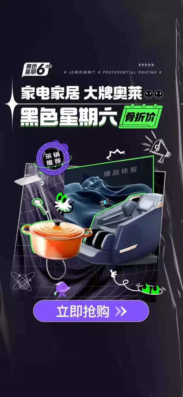 鞭牛士 1月20日消息,临近春节,为让更多用户以实在低价采购年货,满足新年焕新、走亲送礼的春节消费需求,以“又好又便宜”为主题的京东年货节火热召开,家电家居更是带来了满1元享9折、以旧换新补贴翻倍等福利。同时为满足消费者多元化的购物需求,京东家电家居还推出“黑色星期六”活动会场,大小家电、建材家居一应俱全,除了限时直降、满减福利外,更有平板电视、空调、按摩椅、锅具、床、四件套等爆品好物不止5折的超值优惠。不管是居家休息还是享受生活,在京东 “黑色星期六”都能找到适合的低价好物。想要低价买好物的朋友们,只需要每周末打开京东搜索“黑色星期六”,大牌奥莱放价更划算,价格更便宜!