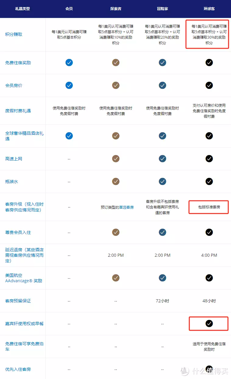 综合来看,凯悦酒店里面最有可玩性和性价比最高的主要是环球客,环球客的专属礼遇包括:最高升级到标准套房、延迟下午4点退房、嘉宾轩使用权或早餐、免费住宿时免费泊车等。 环球客详情待遇如图: