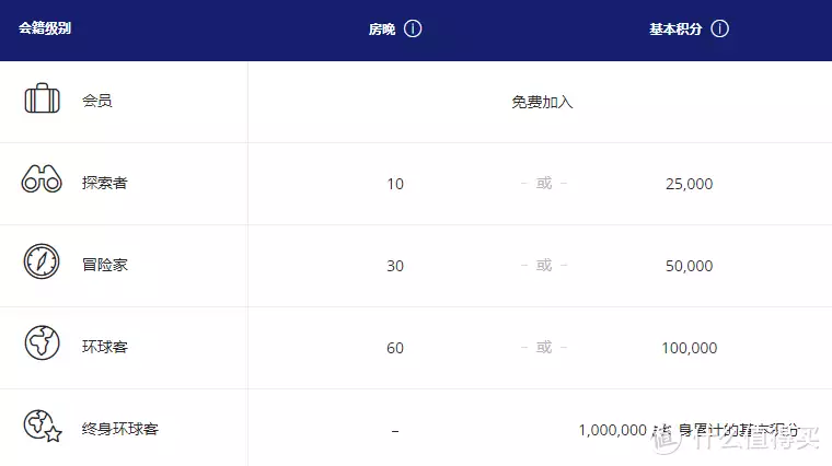会籍共分5级:会员Member、探索者Discoverist、冒险家Explorist、环球客Globalist、终身环球客Lifetime Globalist。