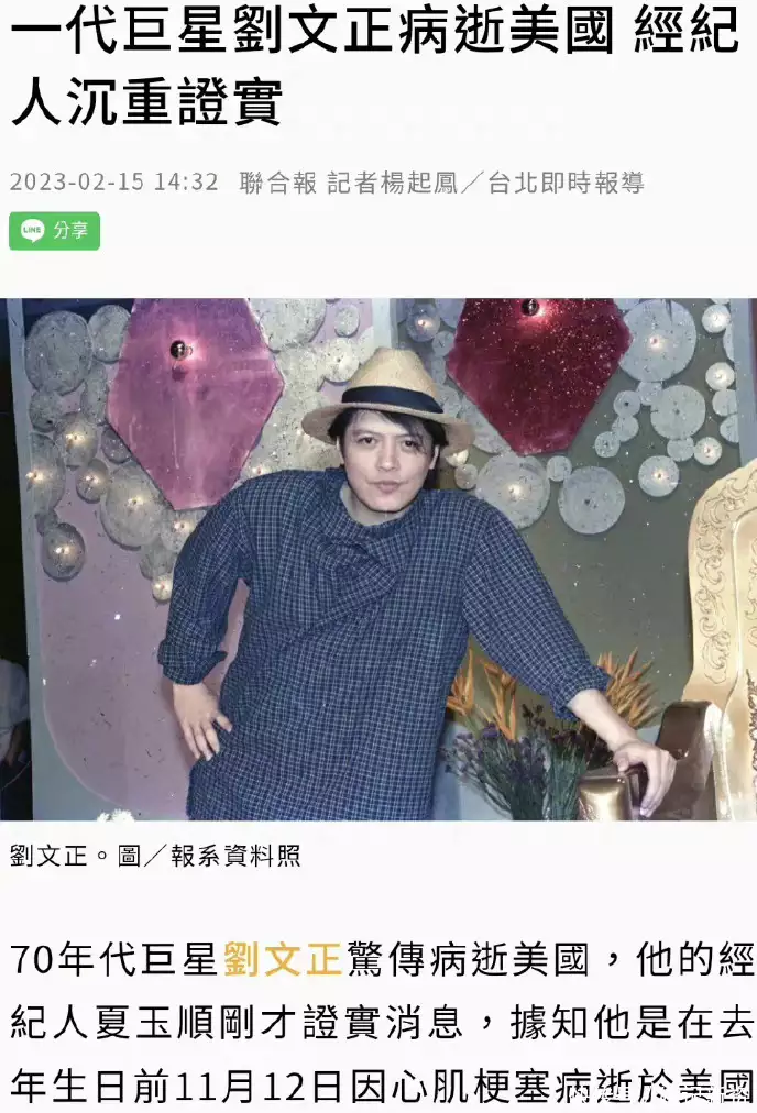 2月15日,又一则不幸的消息传出,著名歌手刘文正于2022年11月12日因心肌梗塞病逝于美国,享年70岁。