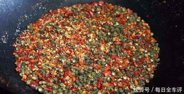 1、这时间来炒调料,锅里不用放油,加盐20克、花椒30克、白芝麻20克、辣椒面60克,小火慢慢炒,花椒炒香后就可以关火倒出来。
