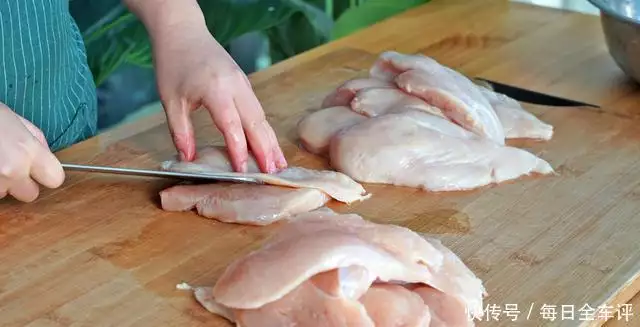2、鸡胸肉是比较厚的,先一分为二切成薄一点的两大片肉。