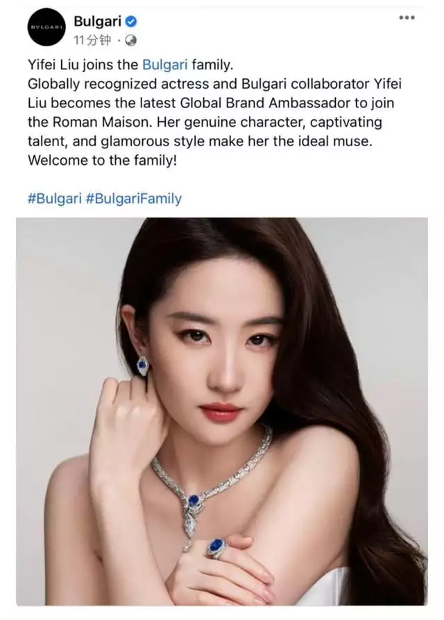 23日,宝格丽在全球各大社交媒体中同时宣布刘亦菲成为品牌全球代言人。并发布了刘亦菲佩戴高级灵蛇系列珠宝的照片,这个代言人的排面给的足足的。