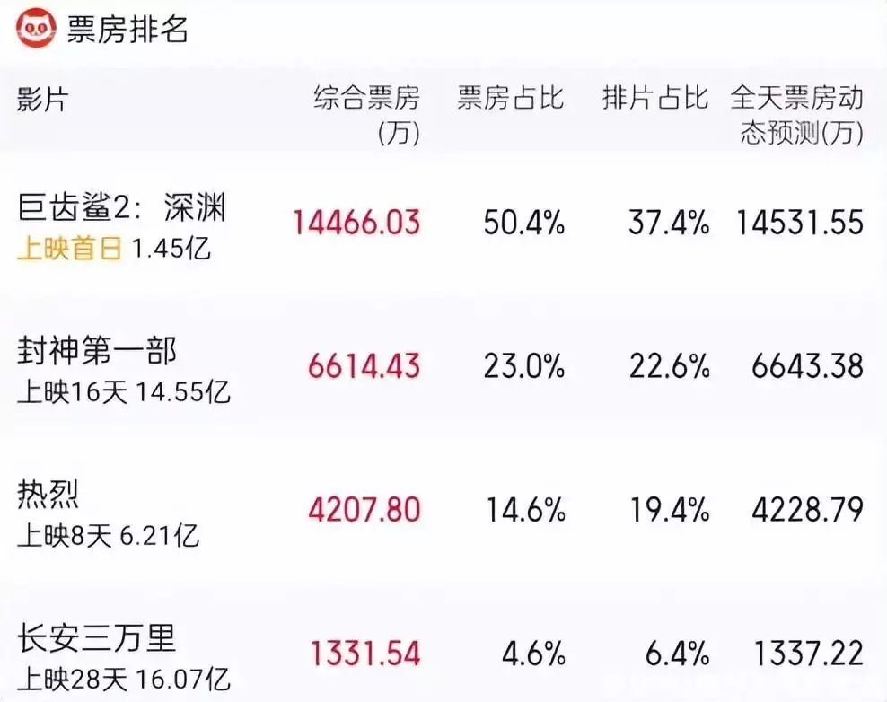 没一部是“善茬”,但《巨齿鲨2》单日依然轻松甩开了第二名《封神》8000多万票房。