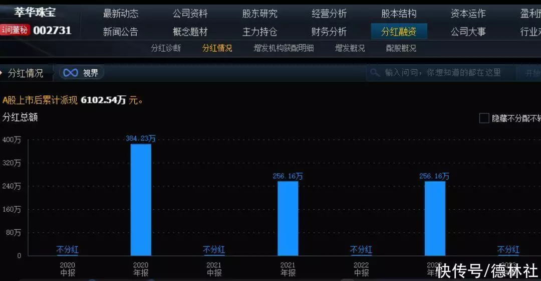 同花顺显示,2020年至2022年,萃华珠宝分红金额分别是384.23万元、256.16万元、256.16万元,当年净利润分别是2881.08万元、3408.79万、4780.75万,分红占净利润比例分别为13.34%、7.51%、5.36%。