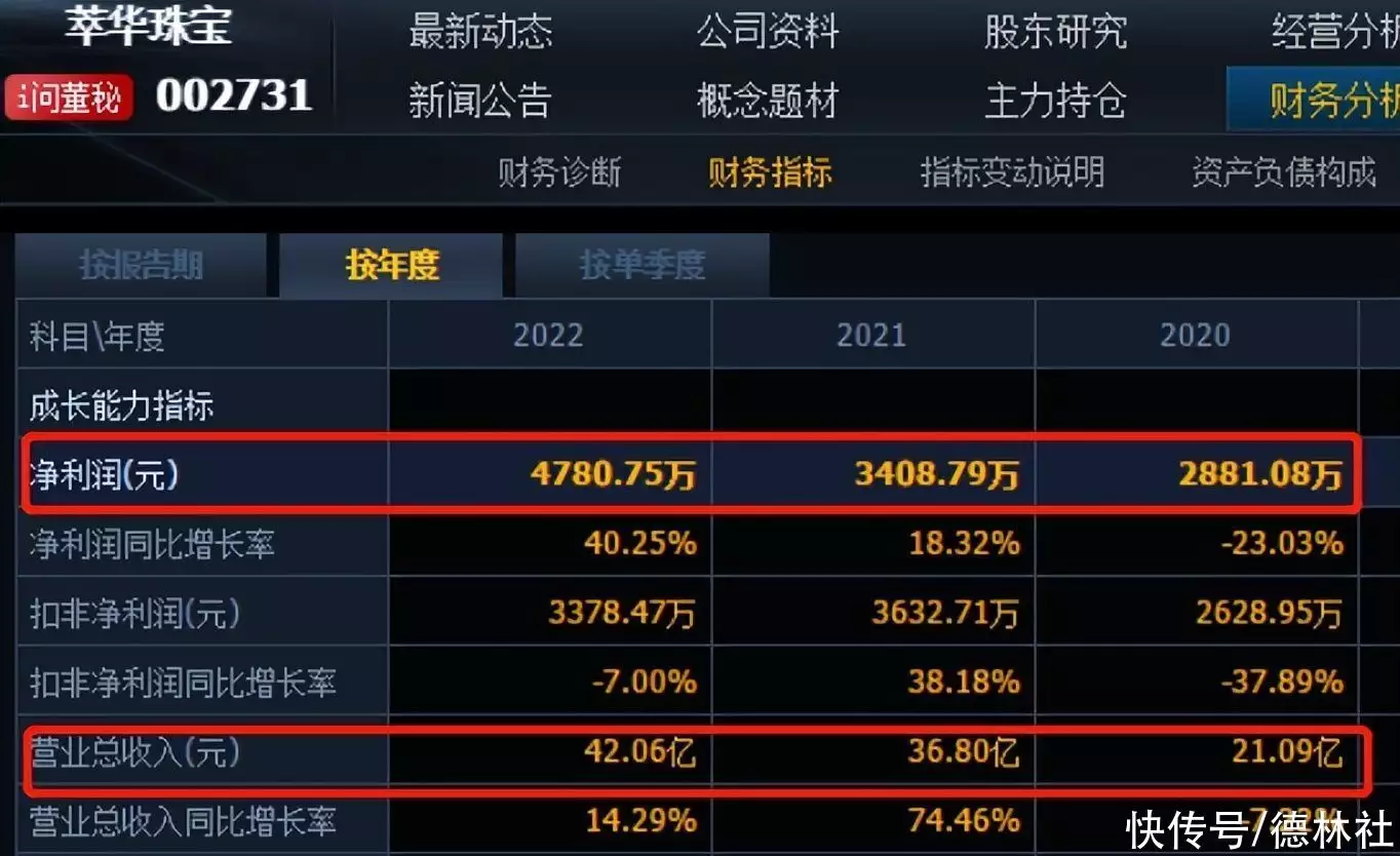历史业绩来看,2020至2022年,萃华珠宝营收从21亿元增长至42亿元,实现翻倍,净利润逐步增长,从2881万元增长至4780万元。