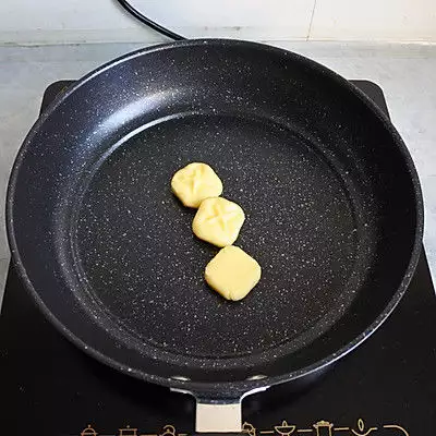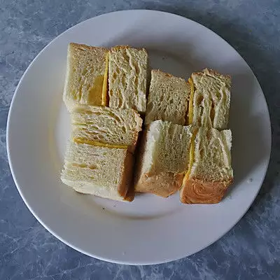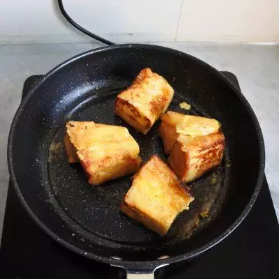 4、把切好的吐蘸上蛋奶液,煎到四边金黄