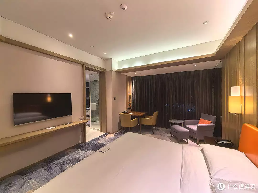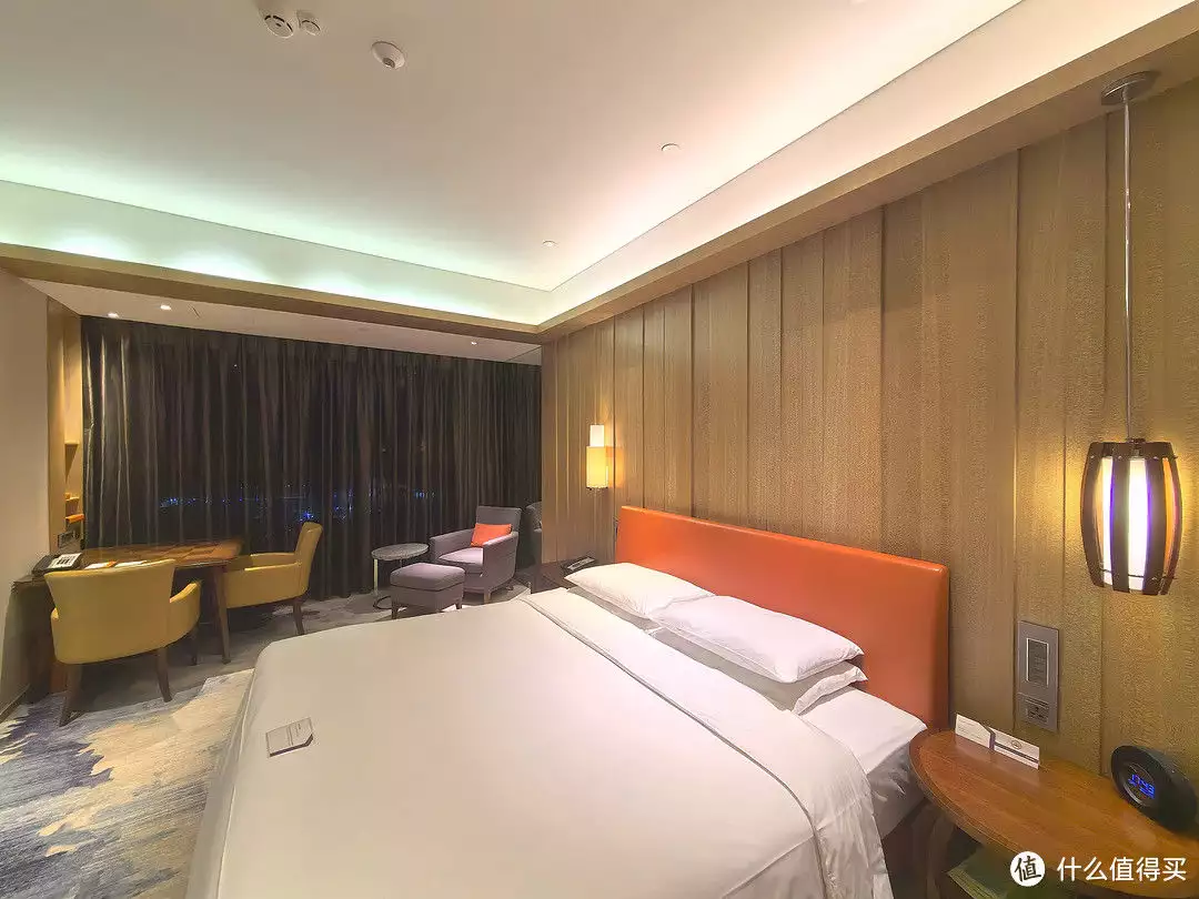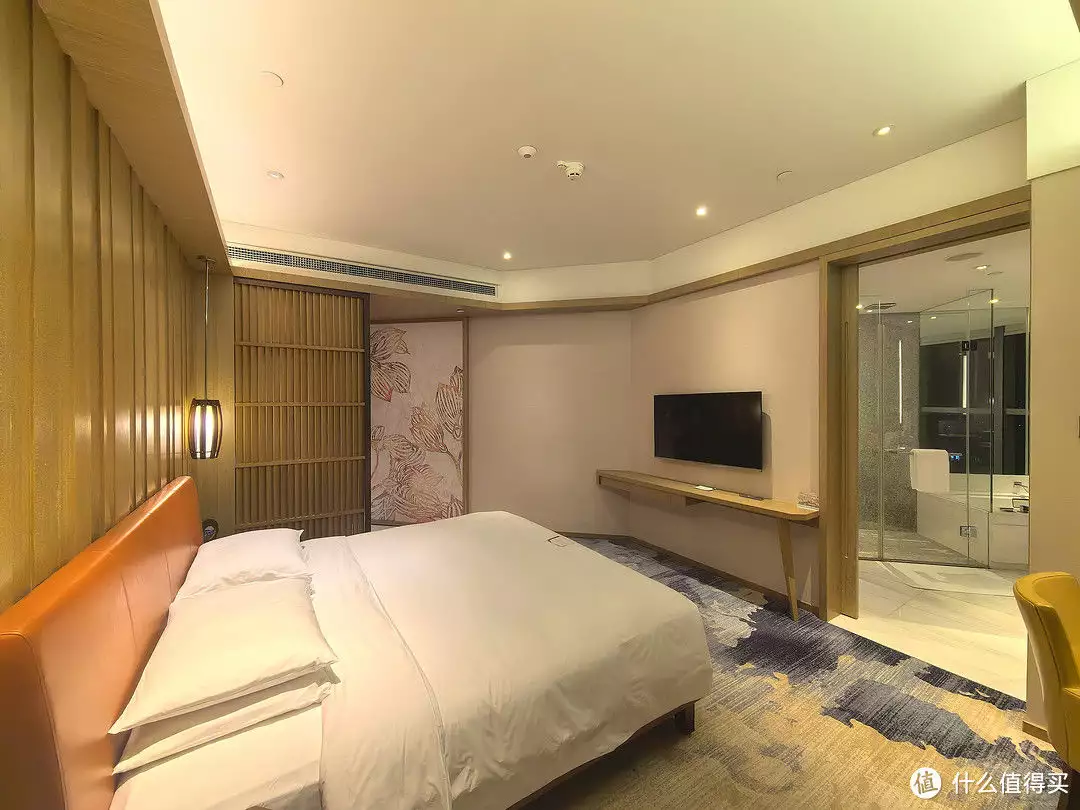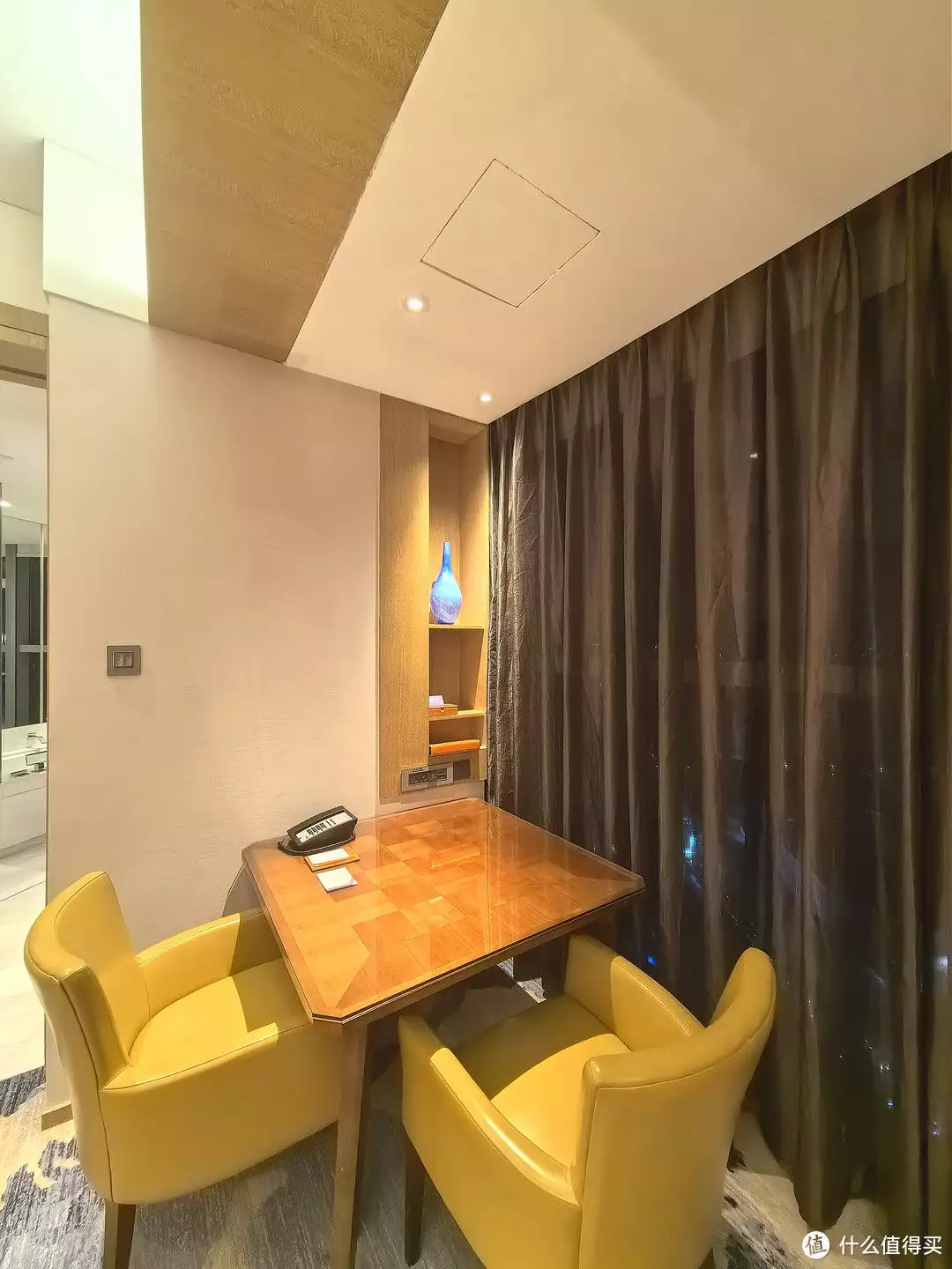 房间感觉也没什么可说的,套内面积体感35平左右吧,推门一个半透的木栅栏就能看到床了,没有床尾凳,靠窗摆了个餐桌权当办公桌了,也没配备专业的人体工学椅,作为商务酒店确实欠缺。