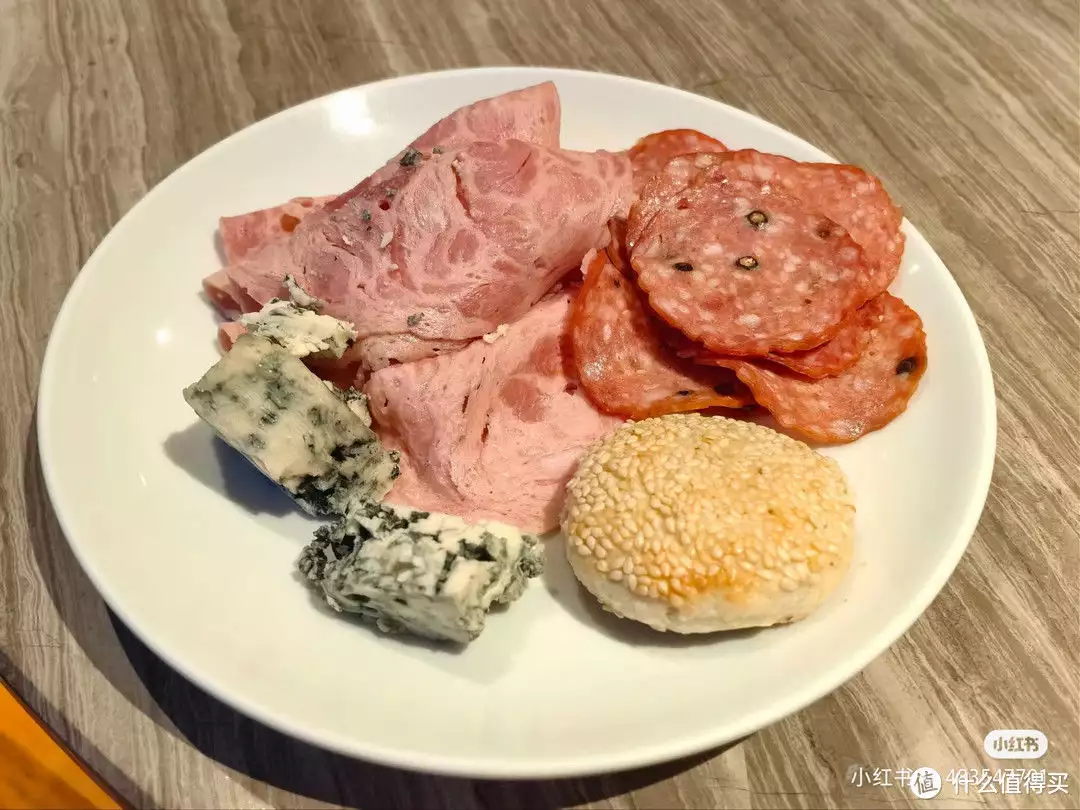 当天的汤是奶油蘑菇汤不过很一般,冷切档有蓝纹奶酪很不错,但比较奇怪的是,他家无论萨拉米还是其他火腿切片,都出乎意料的咸!要知道楼主可是能直接白口炫几大盘火腿,几块蓝纹芝士的重口味,都会觉得咸,吃了几片就败下阵来,以至于第二天早餐再看到都不敢拿了。