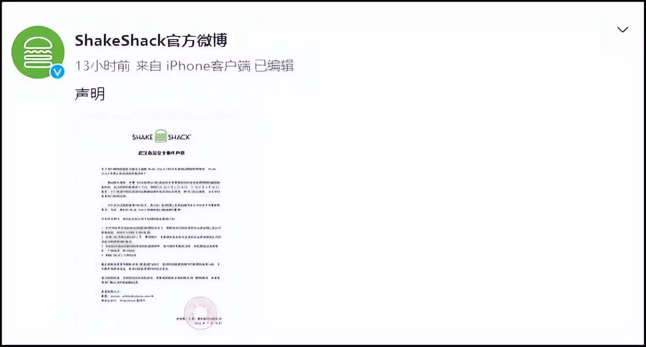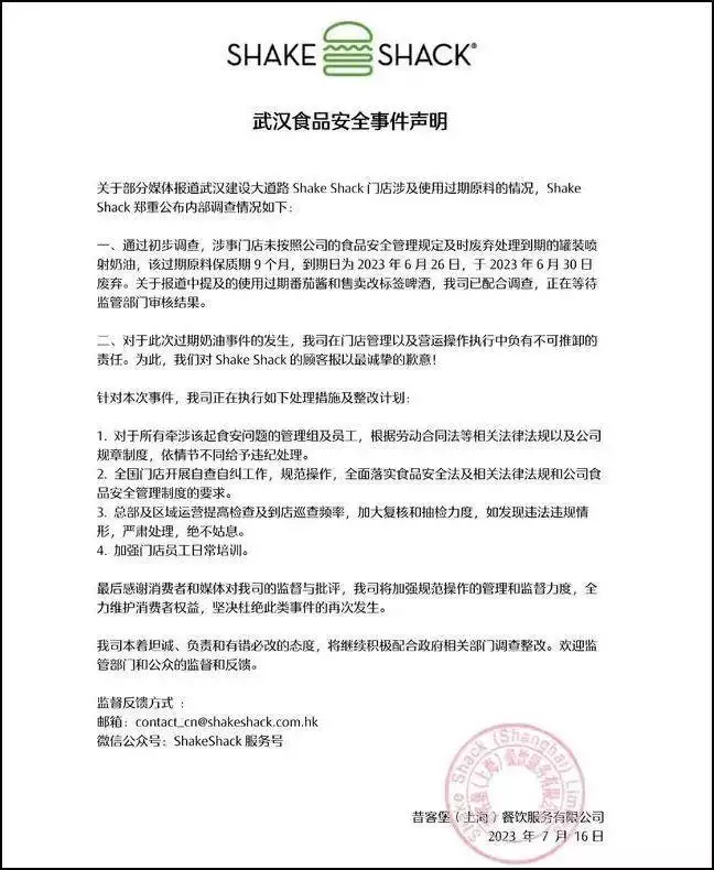 针对被曝武汉门店使用过期原料情况,7月16日23时快餐品牌@ShakeShack官方微博公布内部调查情况并致歉: